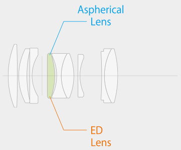 obejmuje 9 elementów w 7 grupach, w tym jedną soczewkę asferyczną ze